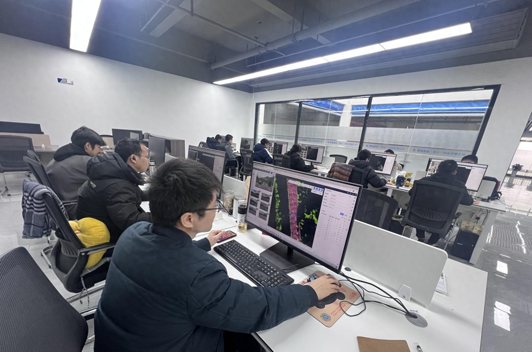 12月11日,四川中鸿数智信息技术有限公司(以下简称“中鸿数智”)办公区,数据标注师正在作业。电脑界面上,不同颜色的点云组成了一个3D场景。随着鼠标滑动,3D场景逐渐能被大致判断——一辆辆汽车正在高速路面行驶。